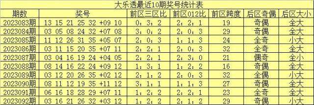 大乐透第2023092期奖号开出:03 16 21 26 32 +03 12。其中前区三区比为1:2:2,012路比为2:1:2,后区开出一大一小、一奇一偶奖号。