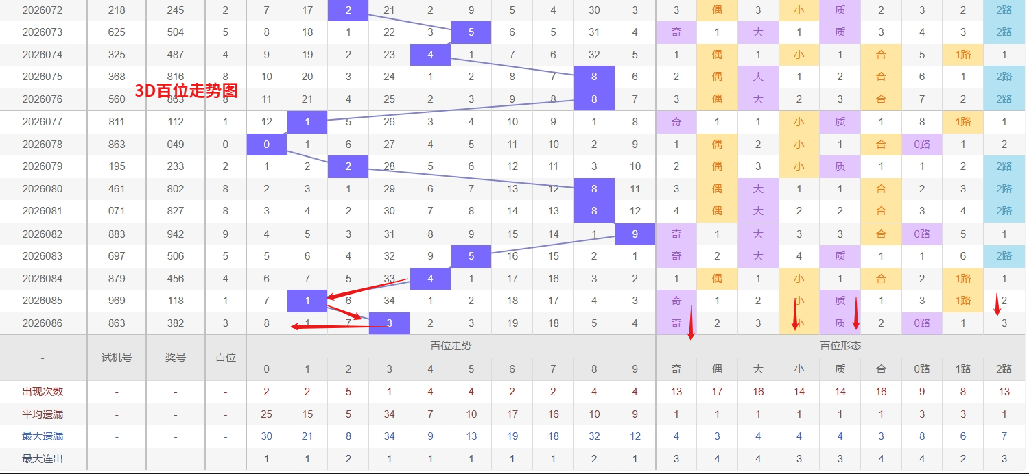 福彩3D百位分析:第2026086期百位开出号码3属于小奇数,从上面百位走势图上可以看出近100期大小比约为53:47奇偶比约为51:49。近期数据还是比较极端的符合文章开头介绍的求均衡规律非等量现象。但这种均衡不会持续最终会被偏态运行打破,然后循环往复。但短期内大小相差2点,大数过热小数有回补需求本期个人认为走小数的概率更高。上期百位落号“3”号球,在百位号码开出0路号码3后向大数方向走出2个振幅。那么通过分析上期百位落位号码分析,号码走出2个振幅,号码走为小奇数,开出0路号码3。通过对百位落号趋势来分析,百位号码落位前端,通过对近10期的走势来看百位号码大小交替频繁走2期大数又走3小数,近期3D百位走势中,数字3虽然刚刚开出,但其此前经历了较长遗漏周期,积累了较强的回补动能,往往冷号解冻后容易出现连下走势,尤其在当前出号节奏偏活跃的阶段,3的重复开出概率并不低,需重点留意;而数字2则作为近期热号,出现频率稳定、间隔紧凑,属于百位上持续有表现力的号码,虽然热度高,但正因如此,其顺势再出的防守价值依然存在。我们在百位关注的重点在02347这5个号码球上,百位号码近期奇偶切换频繁,3号球码属于0路号码奇数,现奇数开出过多有向偶数的趋势。所以福彩3D第2026087期百位看02347。