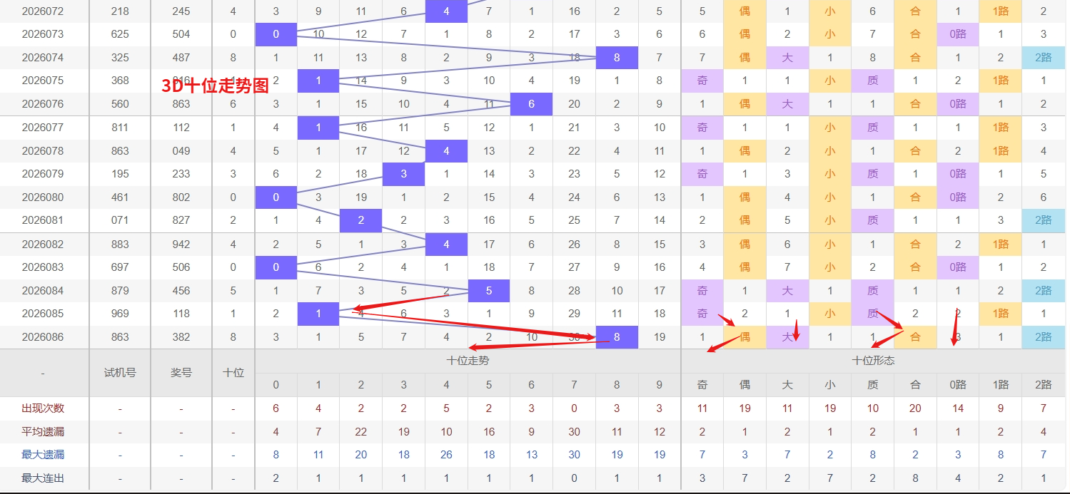 福彩3D十位分析:第2026086期十位开出号码8属大偶数号码后端。以历史100期数据为例十位奇偶比约为55比45,大小比约为48比52近期大小相差7点,根据求均衡的规律开出大数的概率比小数高一点。上期我们分析奇数经过连续回补后有走偶数的可能,开出奖号8大偶数符合我们的预期,近期3D十位走势中,数字7已遗漏长达30期,属于深度冷号,从历史出号规律来看,长时间未出的冷号往往临近回补窗口,即便不会立即转为热态,但其反弹动能正在持续积累,未来几期需要将其作为重点防守对象;而数字0则是近期十位上的明显热号,出现间隔短、重复频率高,出号节奏较为稳定,在当前格局下仍有继续走热的可能。所以福彩3D第2026087期十位推荐04567。
