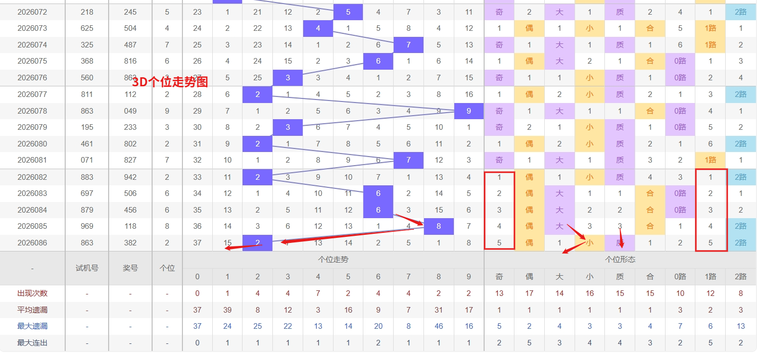 福彩3D个位分析:第2026086期个位开出号码2属于小偶数前端,从以上个位走势图中可以看出近100期的大小比约为53:47奇偶比约为54:46大小奇偶数据上有点差异有需求但不是太明显,不太好看这时就要借助连线走势和遗漏数据来帮助我们缩水号码。上期个位落号“2”小偶数2路号码球,号码开出了6振幅,连续多期的小振必被大振幅取代幅符合我们的预期,那么本期我们在个位考虑振幅走势走前依然要转变思路考虑大振幅,具体考虑(1-5)个振幅是我们主要的方向,那么在对个位落号情况进行系统的分析时我们可以明显的看到个位号码走势呈现大范围震荡,尤其是在号码的落位特点上表现的尤为突出,那么本期我们在个位分析时就要注意号码的风险,避免出现踏空。近期3D个位走势中,数字0和1均处于冷态,两者遗漏周期较长,回补需求正在同步积累,尤其是当个位连续多期未出现小号区间时,冷号反弹的概率会明显上升,0和1都值得纳入防守范围;而数字4则是当前个位上的明显热号,出现频率高、间隔紧凑,出号节奏稳定,在冷热交替尚未完成之前,仍有继续走强的可能。综合来看,冷号0和1的回补潜力与热号4的延续性应一并考虑,因此福彩3D第2026087期个位看好01359。