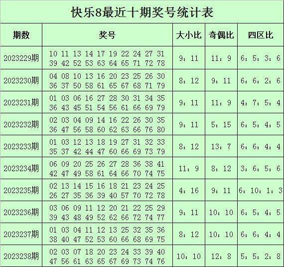 福彩快乐8第2023238期开奖回顾:02 03 07 18 20 23 24 33 39 40 47 56 61 63 65 67 69 73 74 76,其中奖号四区比为5:5:2:8,奇偶比为12:8,大小比为10:10。