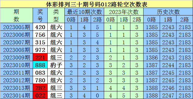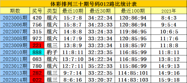 开奖回顾:排列三第2023014期奖号为:022,号码012路比为1:0:2。
