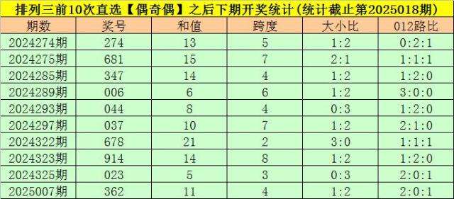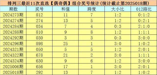 开奖回顾:排列三第2025018期开出奖号:292,类型为组三,和值为13,奇偶比为1:2,大小比为1:2,跨度为7。