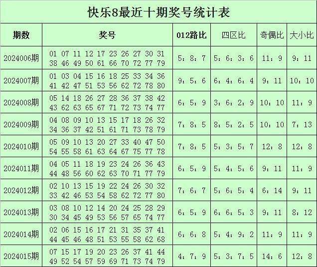 福彩快乐8第2024015期开奖回顾:07 15 17 19 20 23 26 37 41 44 49 52 54 57 59 69 71 73 74 79,其中奖号012路比为4:7:9,四区比为5:3:7:5,奇偶比为14:6,大小比为12:8。