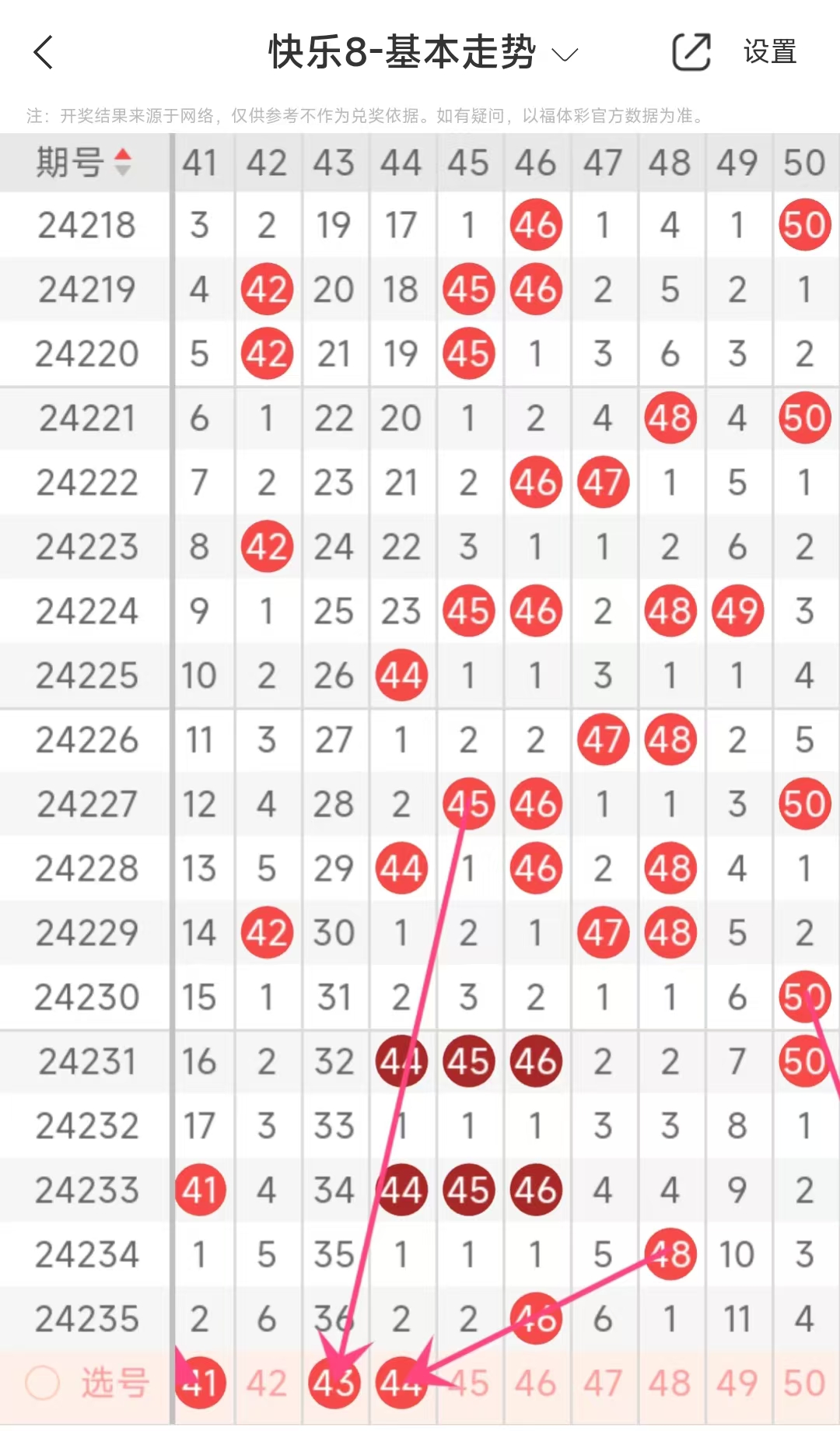 上期第五区间开出46,本期我们可以从上面走势图中看到选号的思路,本期推荐41 43 44