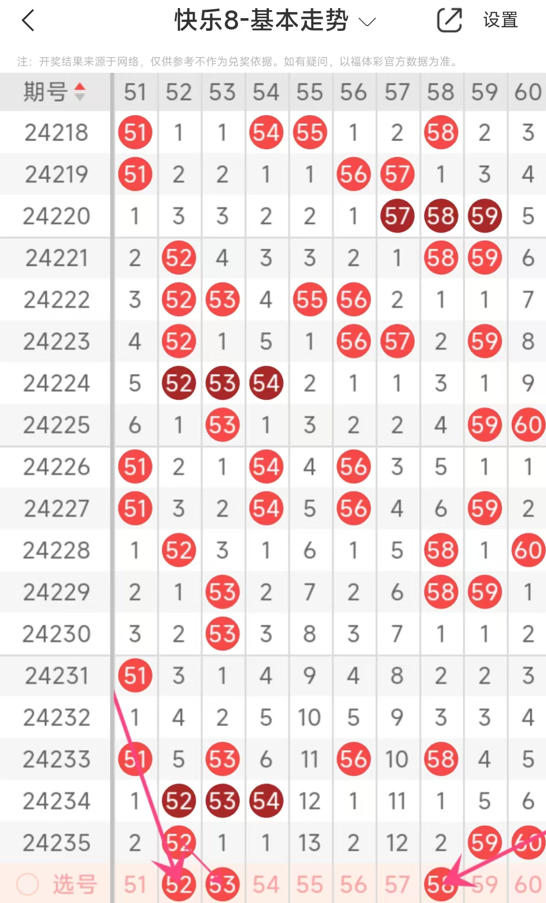 上期第六区间开出52 59 60,本期我们可以从上面走势图中看到选号的思路,本期推荐52 53 58