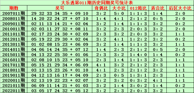 3、在历史同期第011期开奖中,前区号码大小总比例为37:43,小号走势明显较热,本期适当关注小号走冷,看好大小比3:2;