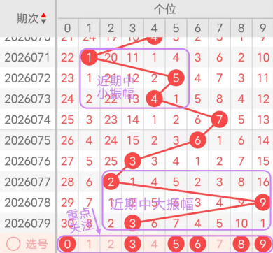 近7期(073~079)开奖号个位号码球分别为4、7、6、3、2、9、3,开奖号与上一期走出的振幅分别为1、3、1、3、1、7、6。073期走出4号中小数号码球,走出“1”的小幅度,074期走出7号大数号码球,走出“3”的中小幅度,075期走出6号中大数号码球,走出“1”的小幅度,076期走出3号中小数号码球,走出“3”的中小幅度,077期走出2号小数号码球,走出“1”的小幅度,078期走出9号大数号码球,走出“7”的大幅度,079期走出3号中小数号码球,走出“6”的中大幅度;从近期振幅大小的走势及大小走势来看,中大振幅走在5~6之间较为适宜,中小振幅走在0~3之间较为适宜;结合走势图的整体及大小走势分析,本期个位应重点关注号码球为0、3、5、6、8、9。