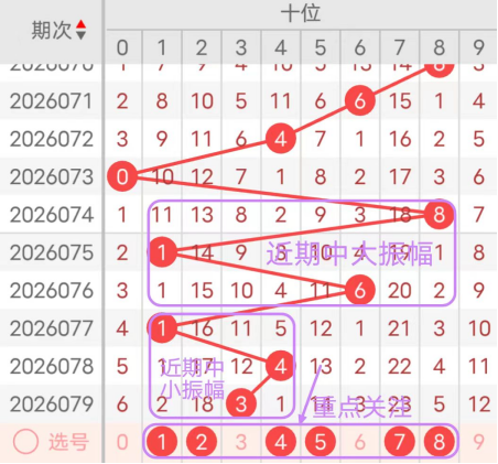 近7期(073~079)开奖号十位号码球分别为0、8、1、6、1、4、3,开奖号与上一期走出的振幅分别为4、8、7、5、5、3、1。073期走出0号小数号码球,走出“4”的中小幅度,074期走出8号大数号码球,走出“8”的大幅度,075期走出1号小数号码球,走出“7”的大幅度,076期走出6号中大数号码球,走出“5”的小幅度,077期走出1号小数号码球,走出“5”的中大幅度,078期走出4号中小数号码球,走出“3”的中小幅度,079期走出3号中小数号码球,走出“1”的小幅度;从振幅大小及走势图的整体对应来看,中大振幅走在4~5之间较为适宜,中小振幅走在1~3之间较为适宜;结合走势图的上下对应及振幅大小分析,本期十位应重点关注号码球为1、2、4、5、7、8。