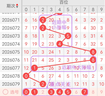 近7期(073~079)开奖号百位号码球分别为5、4、8、8、1、0、2,开奖号与上一期走出的振幅分别为3、1、4、0、7、1、2。073期走出5号中大数号码球,走出“3”的中小幅度,074期走出4号中小数号码球,走出“1”的小幅度,075期走出8号大数号码球,走出“4”的中小幅度,076期走出8号大数号码球,走出“0”的小幅度,077期走出1号小数号码球,走出“7”的大幅度,078期走出0号小数号码球,走出“1”的小幅度,079期走出2号小数号码球,走出“2”的小幅度;从振幅大小及走势图的整体形势,中大幅度走在3~5之间较为适宜,中小幅度走在1~2之间较为适宜;结合走势图的整体及大小走势分析,本期百位需重点关注号码球为0、1、3、4、5、7。