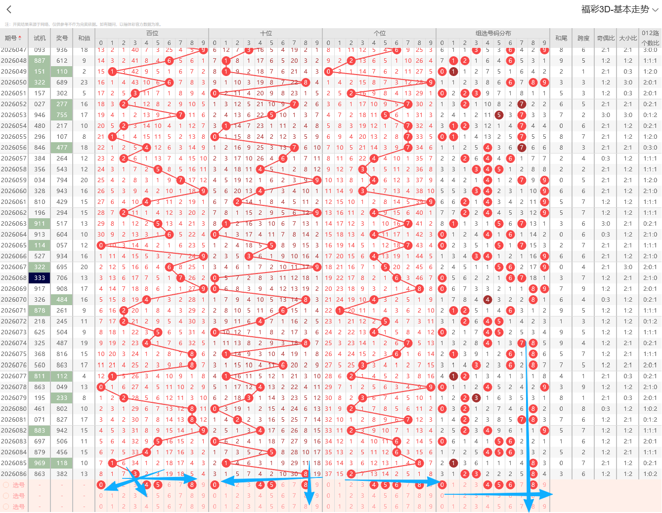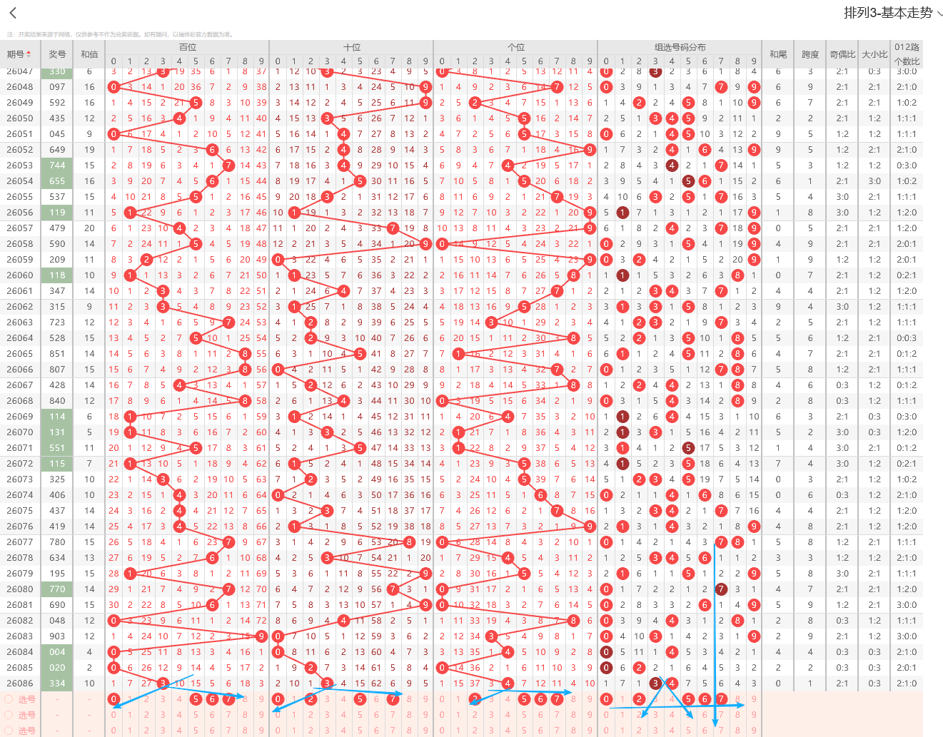 ①百位:上期开出小号奇数3号,在历史开奖记录中显示一般正常的奇偶周期平均在1~3期为普遍现象,上期出现奇偶互变为奇数0路号码,依据奇偶以及012路周期性规律的转变特征点即本期1路号码有开出的趋势2路号码注意预防。