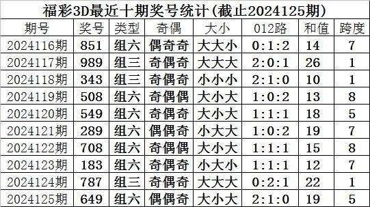 开奖回顾:福彩3D第2024125期奖号为649,奖号形态为:组六、大小大、2:1:0、偶偶奇。