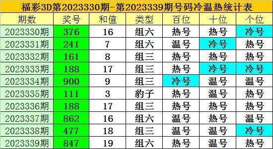 上期回顾:福彩3D第2023339期开奖奖号为:847,奖号类型为:组六,奖号冷温热态为:热号+温号+热号。
