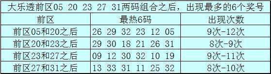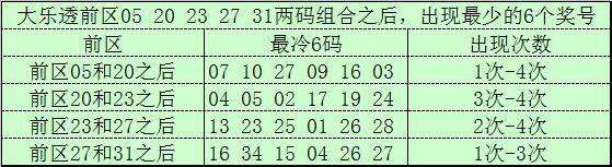 前区冷码统计:大乐透第25037期前区奖号为:05、20、23、27、31,截止第25037期历史上大乐透已经开出了2705期奖号了,在连续两码奖号中: