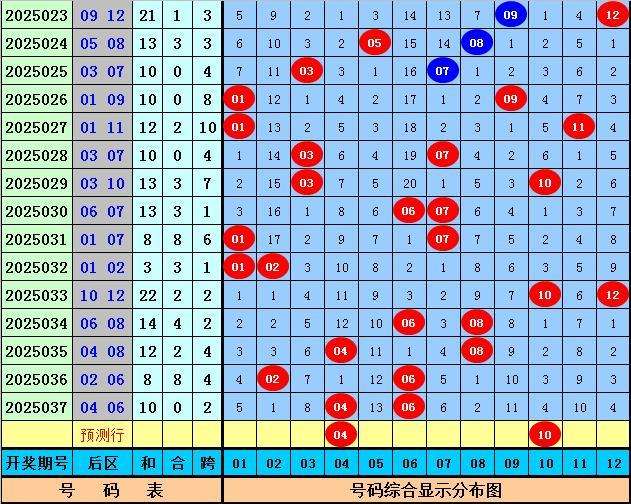 后区上期开出奖号04和06,该组合历史上出现了33次,其下期奖号频次分别为:号码12出现8次,02、06、07出现7次,05、08、09、10出现5次,03、04、11出现4次,01出现3次,本期后区参考号码01、04、07、10,精选两码04和10。