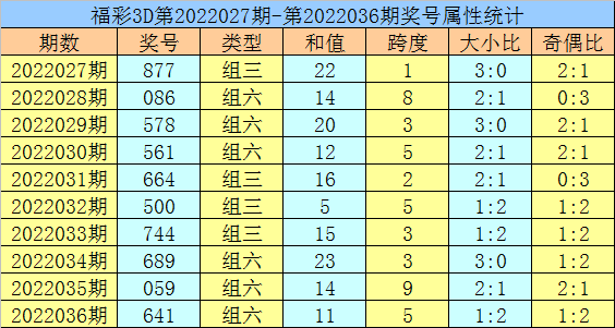 开奖回顾:福彩3D第2022036期开出奖号641。奖号形态为组六,奇偶比为1:2,012路比为1:2:0,大小比为1:2,和值为11,跨度为5。