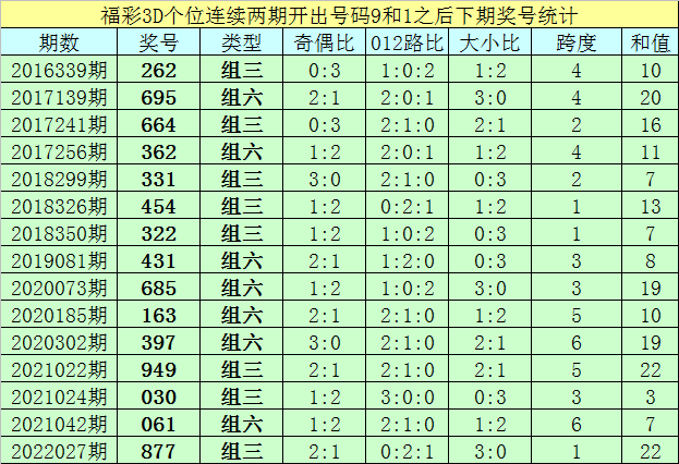 前10期跨度振幅为:1-7-5-2-3-3-2-0-6-4,逐渐下降,跨度出现范围较大,本期跨度大幅调整,重点关注跨度6。