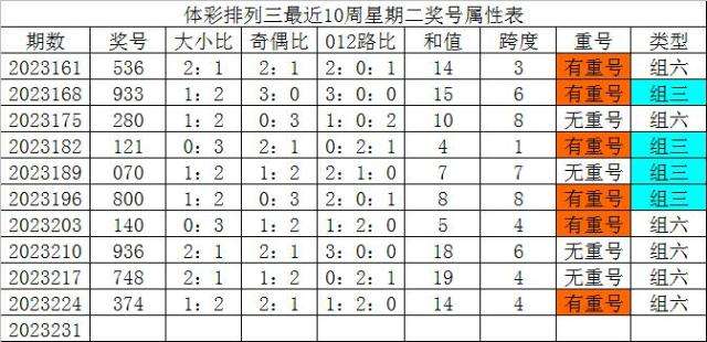 体彩排列三最近10周星期二奖号分别为:536、933、280、121、070、800、140、936、748、374,各奖号属性详见下表:
