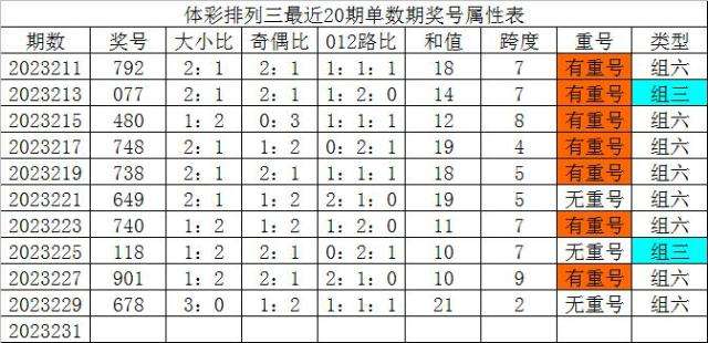 体彩排列三最近20期单数期奖号分别为:792、077、480、748、738、649、740、118、901、678,各期奖号详细属性下表:
