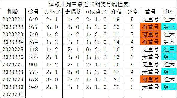 体彩排列三最近10期分别开出奖号:649、977、740、374、118、535、901、773、678、949,各奖号属性详见下表: