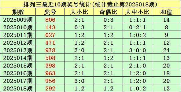 上期回顾:排列三第2025018期奖号为:292。奖号类型:组三,和值:13,奇偶比:1:2,跨度:7,大小比:1:2。