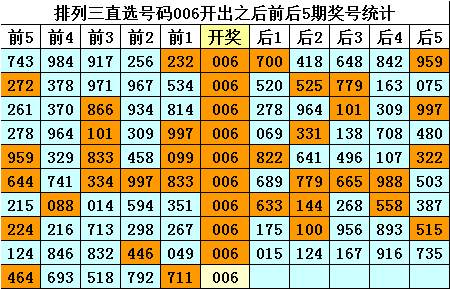四、排列三直选号码006历史上开出10次,其前后五期奖号分别为:
