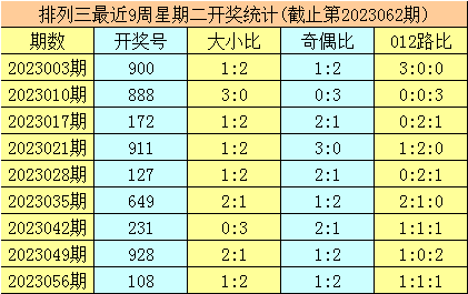 三、体彩排列三前9周星期二奖号分别开出:900-888-172-911-127-649-231-928-108,其中号码012路比为9:9:9,奇偶比为13:14,大小比为12:15;