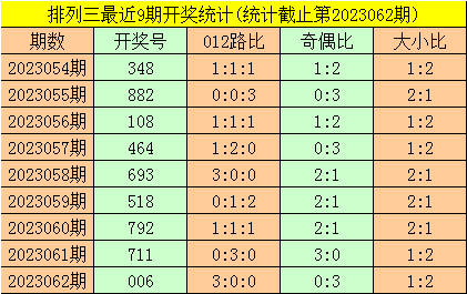 一、排列三第2023062期开出号码006,其奇偶比为0:3,大小比为1:2,号码012路比为3:0:0。该号码直选历史上出现了10次。