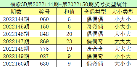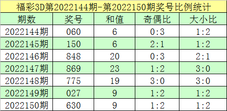福彩3D第2022150期回顾:奖号为630,奖号奇偶比为1:2,大小比为1:2,和值为9,类型为组六。