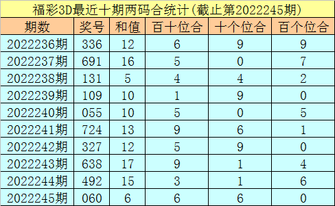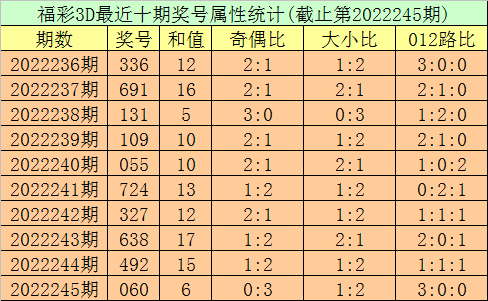 开奖回顾:第2022245期福彩3D奖号为060。奖号形态为组三,大小比为1:2,和值为6,奇偶比为0:3,012路比为3:0:0,跨度为6。