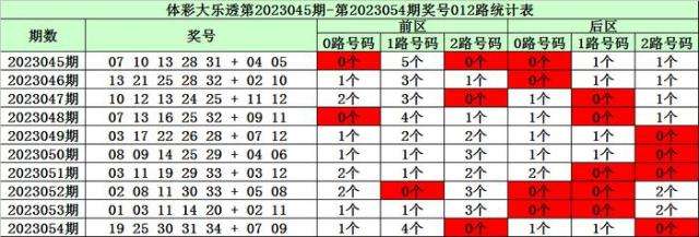 上期回顾:大乐透第23054期奖号为:19 25 30 31 34+07 09,其中前区号码012路比为1:4:0,后区号码012路比为1:1:0。