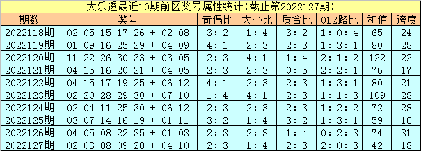 开奖回顾:体彩大乐透第22127期开出奖号为:02 03 08 09 20+04 10,前区质合比为2:3,奇偶比为2:3,大小比为1:4,012路比为2:0:3,后区质合比为0:2,奇偶比为0:2,大小比为1:1,012路比为0:2:0。