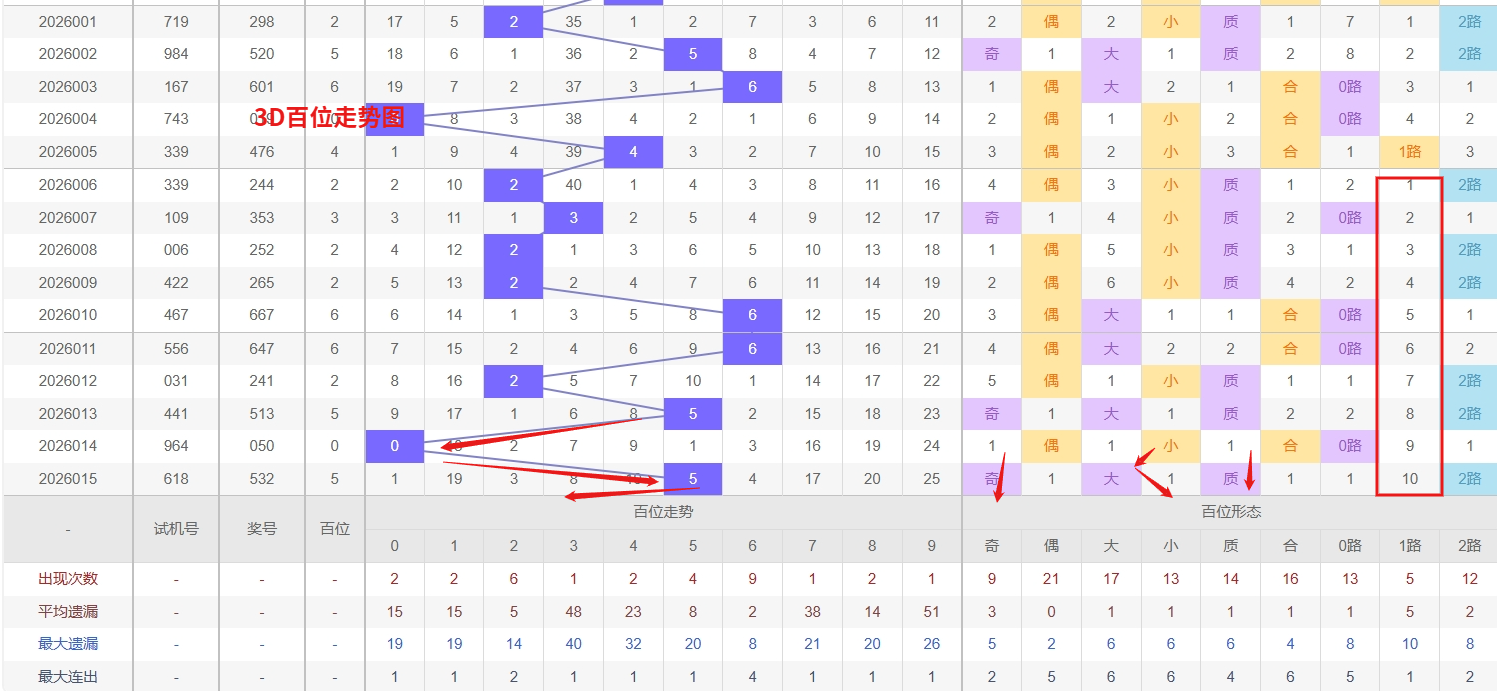 福彩3D百位分析:第2026015期百位开出号码5属于大奇数,从上面百位走势图上可以看出近100期大小比约为54:46奇偶比约为53:47。近期数据还是比较极端的符合文章开头介绍的求均衡规律非等量现象。但这种均衡不会持续最终会被偏态运行打破,然后循环往复。但短期内大小相差5点,小数过热大数有回补需求本期个人认为走大数的概率更高。上期百位落号“5”号球,在百位号码开出2路号码5后向大数方向走出5个振幅。那么通过分析上期百位落位号码分析,号码走出5个振幅,号码走为大奇数,开出2路号码5。通过对百位落号趋势来分析,百位号码落位中端,通过对近10期的走势来看百位号码大小交替频繁走3期大数又走2小数,近期3D百位走势观察,号码6持续走热,呈现明显的热出态势,历史规律表明热号往往具备一定惯性,短期内仍有较大概率实现连下,值得作为重点追踪对象。与此同时,号码1和9均陷入较长遗漏周期,形成显著冷态,从概率均衡与冷热转换的角度分析,冷号随时间推移回补压力逐步增大,需警惕其随时解冻反弹。在关注热号6延续性的同时,对冷号1和9进行合理防守,兼顾趋势的惯性与转折的可能,我们在百位关注的重点在13469这5个号码球上,百位号码近期奇偶切换频繁,5号球码属于2路号码奇数,现奇数开出过多有向偶数的趋势。所以福彩3D第2026016期百位看13469。