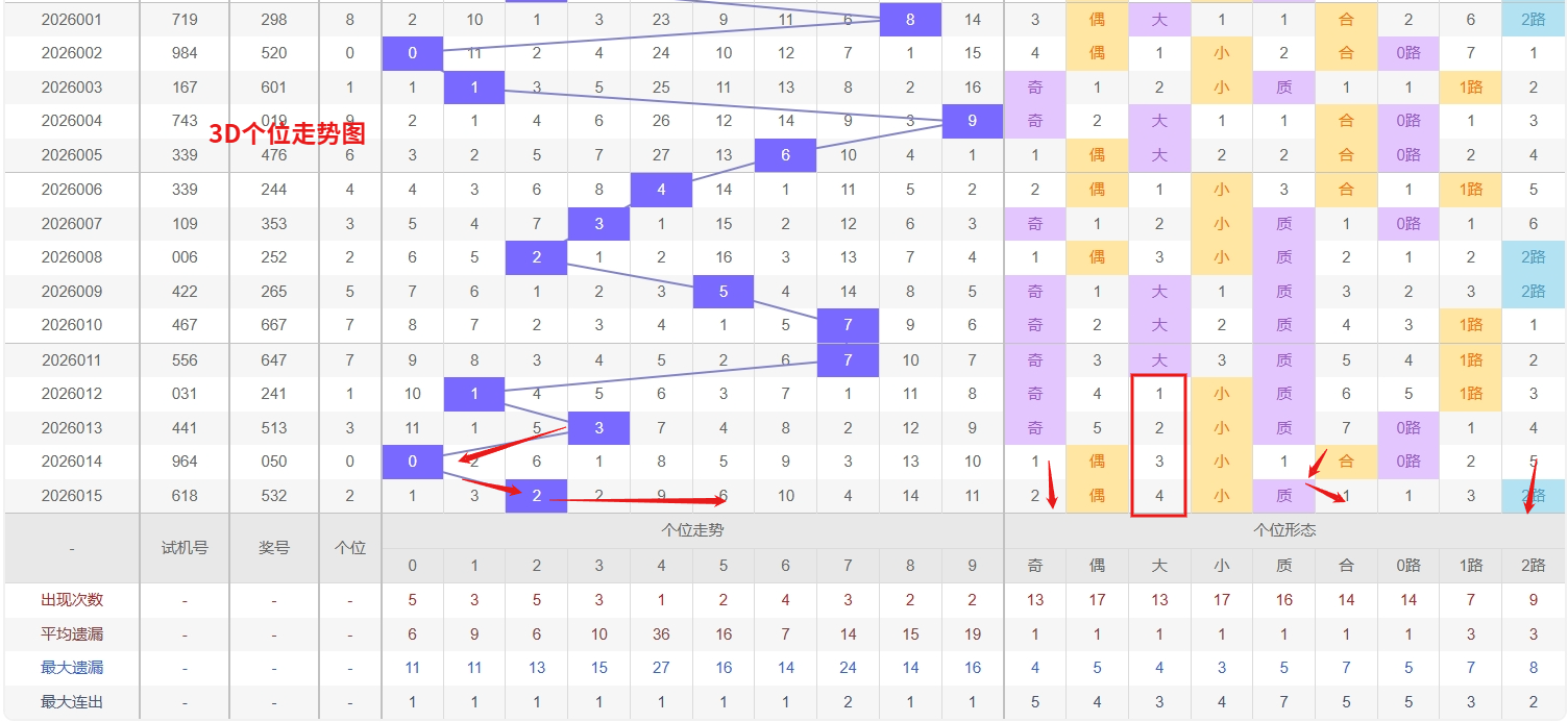 福彩3D个位分析:第2026015期个位开出号码2于小偶数前端,从以上个位走势图中可以看出近100期的大小比约为45:55奇偶比约为52:48大小奇偶数据上有点差异有需求但不是太明显,不太好看这时就要借助连线走势和遗漏数据来帮助我们缩水号码。上期个位落号“2”小偶数2路号码球,号码开出了2振幅,连续多期的大振必被小振幅取代幅符合我们的预期,那么本期我们在个位考虑振幅走势走前依然要转变思路考虑大振幅,具体考虑(1-5)个振幅是我们主要的方向,那么在对个位落号情况进行系统的分析时我们可以明显的看到个位号码走势呈现大范围震荡,尤其是在号码的落位特点上表现的尤为突出,那么本期我们在个位分析时就要注意号码的风险,避免出现踏空。近期3D个位走势来看,号码6表现强势,已形成明确的热态趋势,短期内有望延续其热度,可作为重点追踪对象;而号码4则长期遗漏,冷态显著,根据冷热转换规律,需防范其随时可能出现的回补。在关注热号6的同时,对冷号4保持警惕,因此福彩3D第2026016期个位看好14568。