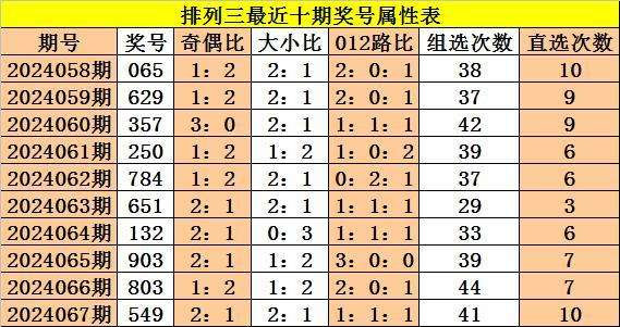 上期回顾:体彩排列三第2024067期奖号:549,奇偶比2:1,大小比2:1,012比1:1:1。