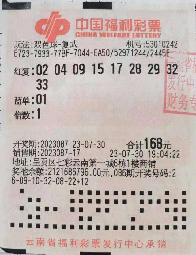 7月31日,双色球第2023087期一等奖得主宋先生(化名)第一时间出现在省福彩中心兑奖室,他凭1张168元的9+1复式票,中得1注头奖,收获总奖金752万多元,该票出自昆明市呈贡区七彩云南第一城6栋1楼商铺53010242号销售网点。