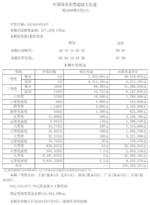 北京时间5月4日晚,体彩超级大乐透第24050期开奖,同时本期也是大乐透10亿大派奖的第21期。当期开奖号码为前区03 04 14 18 26,后区07 09。需要注意的是,本次10亿大派奖活动用于一等奖派奖的3亿元,以及二等奖派奖的1亿元已经于上一期开奖中全部派发完毕,一、二等奖派奖已正式收官。本期开奖结束后,固定奖派奖奖金剩余金额为155,945,390元。本期全国销量为3。17亿元,计奖结束后奖池余额8。15亿元。