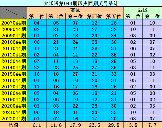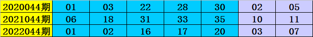 在2020044期-2022044期同周期奖号中,前区连码出现1期,同尾号出现0期,号码奇偶比7:8,大小比8:7,号码012路比5:6:4,前区开出14个号码。