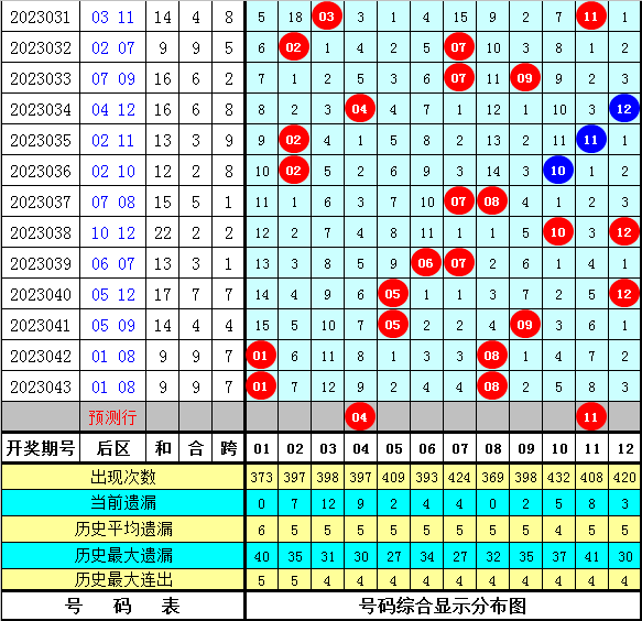 历史号码分析:在大乐透第044期同期奖号中前区连码出现概率为31%,同尾号出现概率为38%。后区第一位1、2路出现概率为75%,第二位1、2路出现概率为81%。