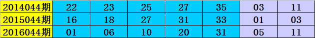 在2014044期-2016044期同周期奖号中,前区连码出现1期,同尾号出现2期,号码奇偶比9:6,大小比11:4,号码012路比5:7:3,前区开出13个号码。