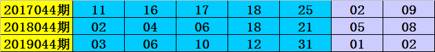 在2017044期-2019044期同周期奖号中,前区连码出现1期,同尾号出现0期,号码奇偶比6:9,大小比5:10,号码012路比7:5:3,前区开出13个号码。