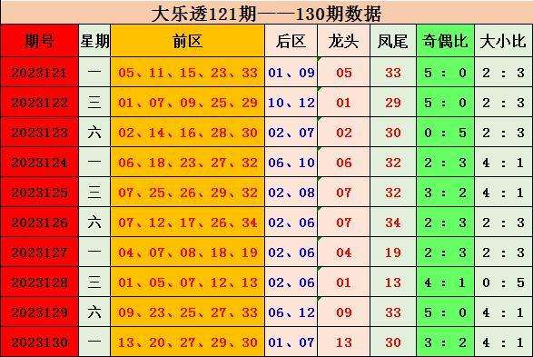 大乐透第2023130期开奖号码:前区13 20 27 29 30,后区01 07;奇偶比3:2:大小比:4:1