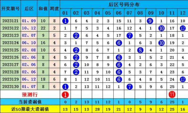 后区第一位:前10期分别开出奖号:01 10 02 06 02 02 02 02 06 01,其中奇数号码开出2次,偶数号码开出8次,奇偶走势偶数占优,本期注意奇数号码出现。参考号码:01。