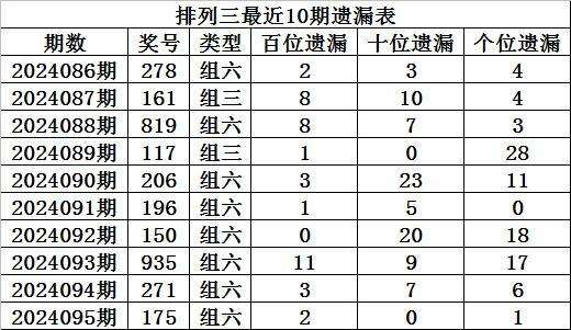上期回顾:排列三第2024095期奖号:175,组六,直选遗漏总值为3期。