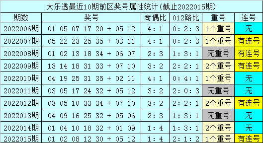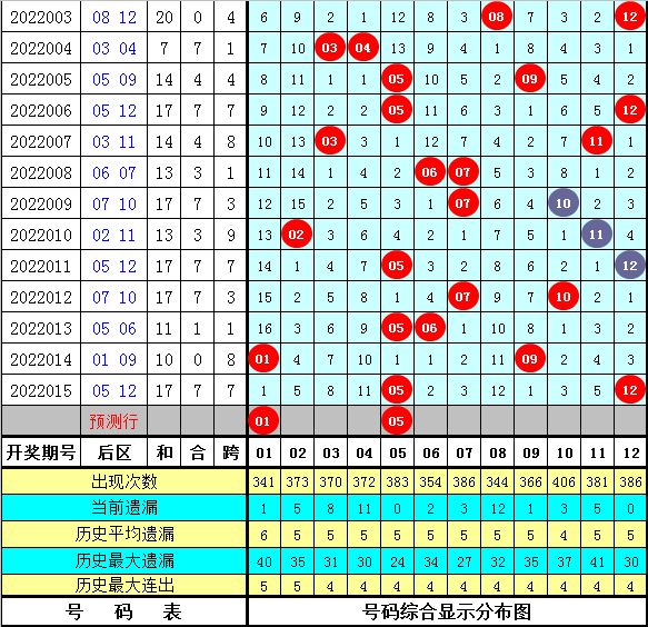 上期回顾:体彩大乐透第2022015期奖号为:01 02 08 12 30 + 05 12,其中前区号码012路比为2:1:2,奇偶比为1:4,包含1个重复号码:01。后区号码和值为17,跨度为7。