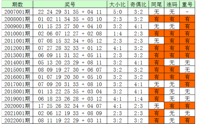前区号码频次:在历史同期中,前区号码03 04 10 14 16 21没有开出过;号码07开出频次最高,出现了5次。