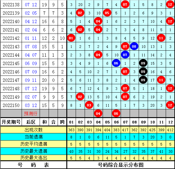后区号码频次:12个号码都已经开出了,其中03、04、08、10、11号码开出频次最高,共出现4次。