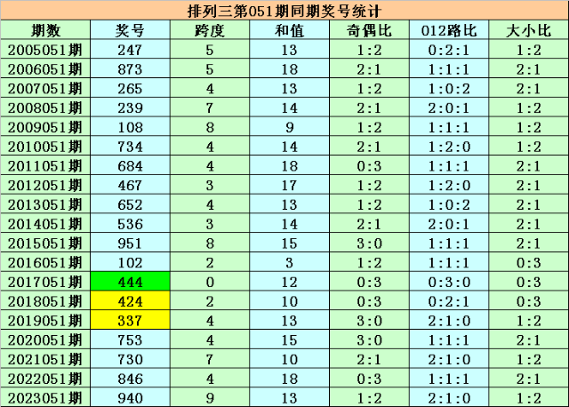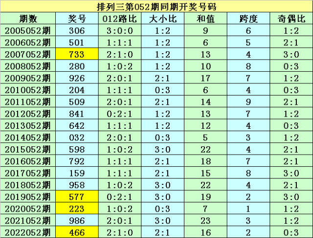 本期为排列三第2023052期开奖,开奖日期为:2023年3月3日,历史上排列三第052期已开出了18次奖号,历年同期开出号码分别为:306-501-733-280-926-204-509-841-642-032-598-792-159-958-577-223-986-466。