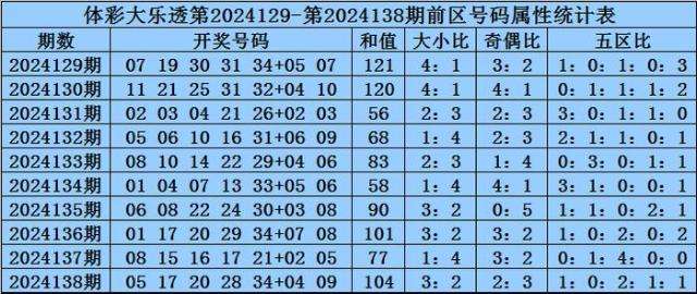 体彩大乐透第2024138期奖号为:05 17 20 28 34+04 09,前区奖号和值开出104,大小比为3:2,奇偶比为2:3,五区比开出1:0:2:1:1。