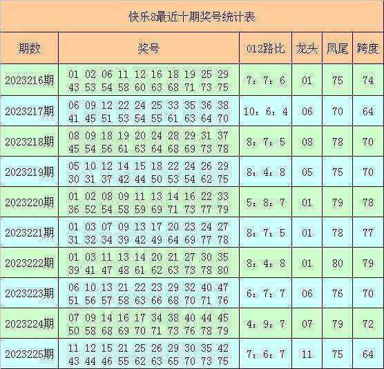 快乐8第2023225期奖号为:11 12 15 21 25 26 29 30 35 42 43 44 46 55 62 63 65 70 73 75,其中奖号012路比为7:6:7,0路号码(7个):12、15、21、30、42、63、75,1路号码(6个):25、43、46、55、70、73,2路号码(7个):11、26、29、35、44、62、65。